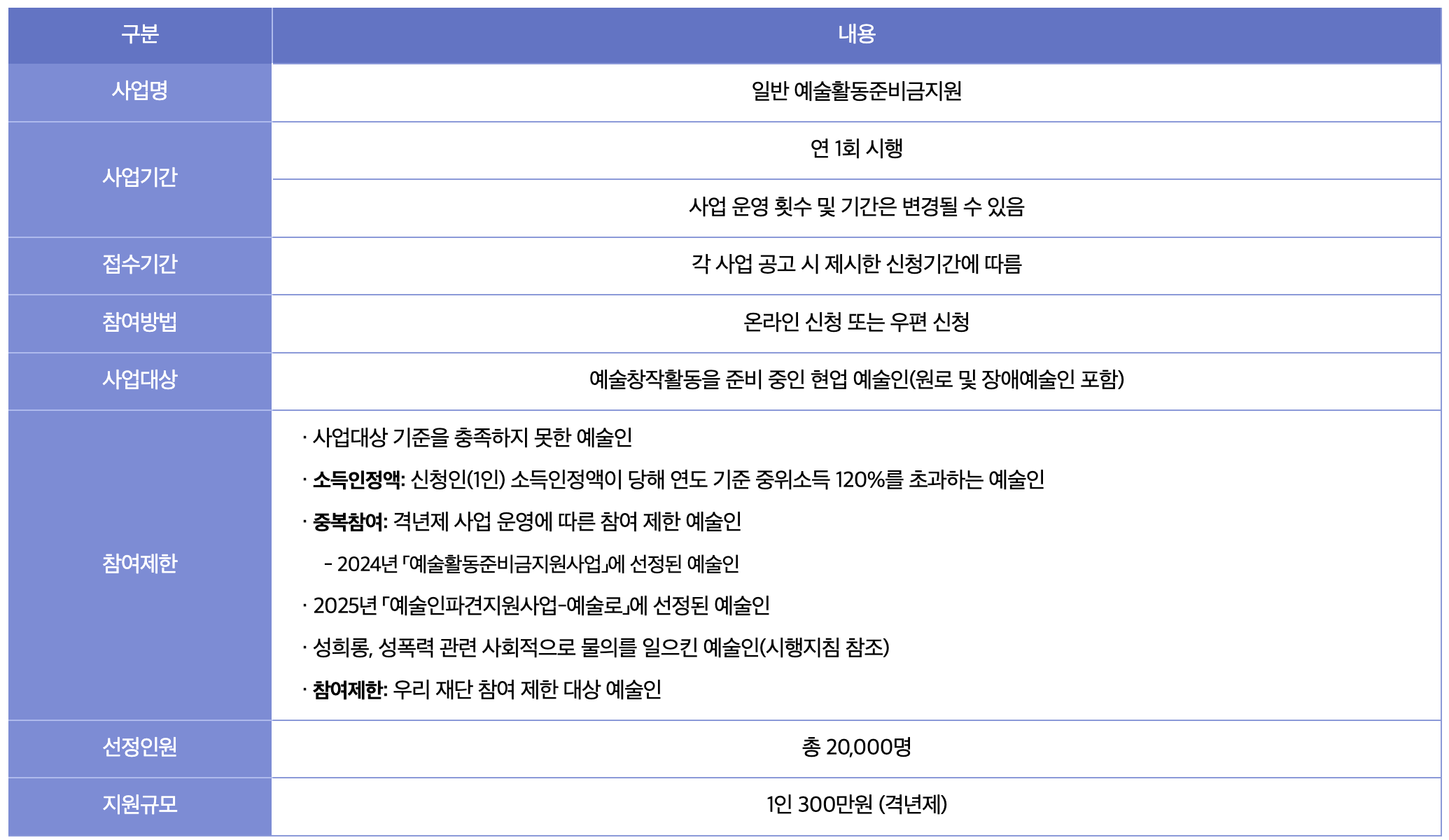 - 예술활동증명을 완료한 예술인: 공고일 기준으로 예술활동증명이 유효한 국내 거주 내국인 예술인