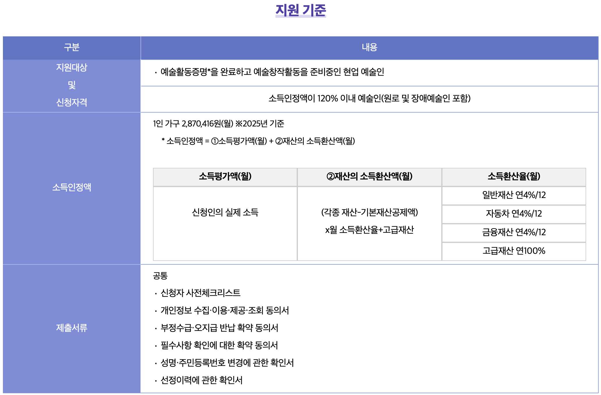 - 소득인정액이 기준 중위소득 120% 이하인 예술인: 1인 가구 기준 월 2,870,416원 이하 (원로 및 장애예술인 포함)